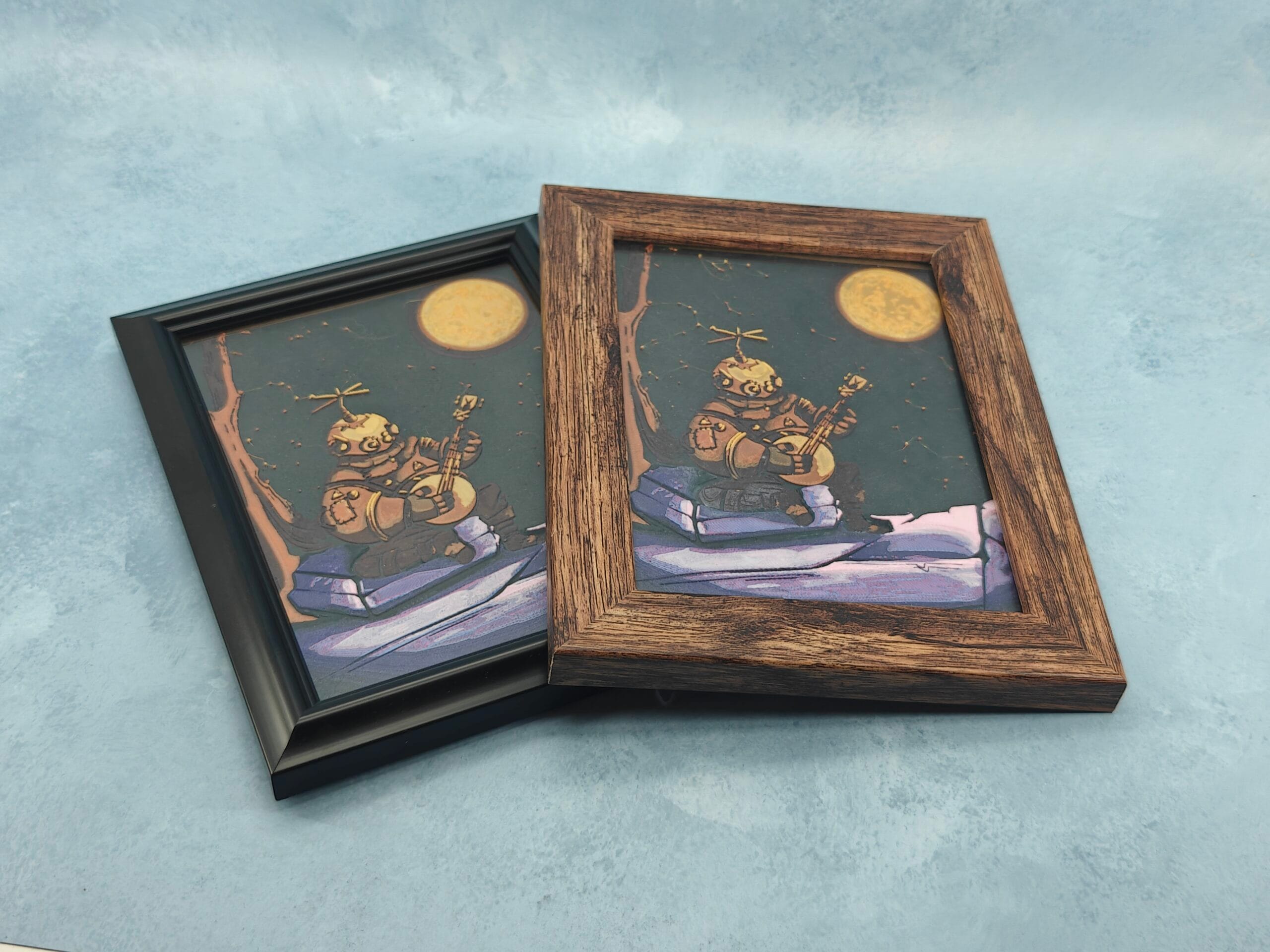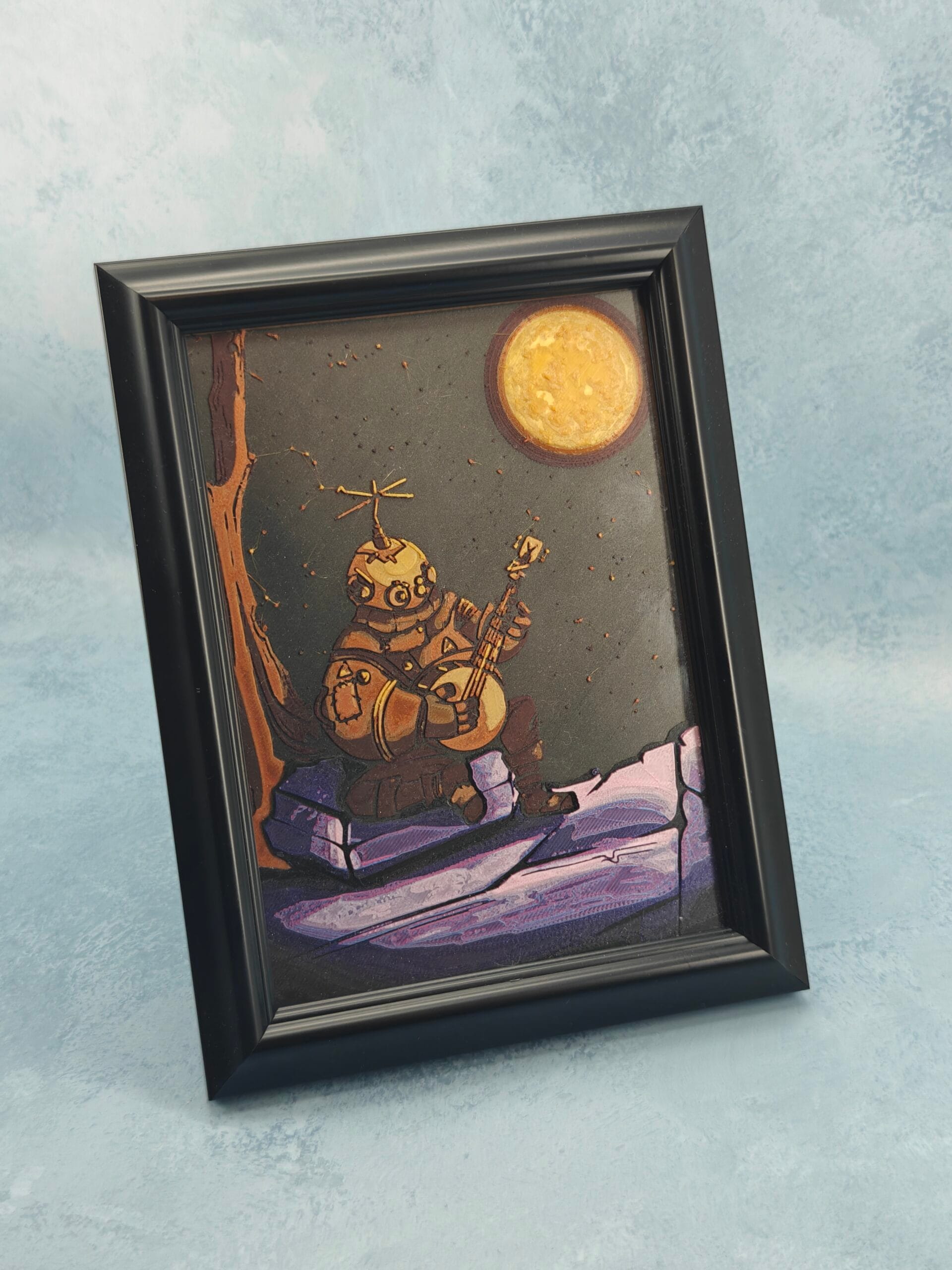 This is a 3D Printed artwork of Riebek from Outer Wilds. Riebek is playing his banjo on Brittle Hollow, with the sun in the background. Spoiler-free print.